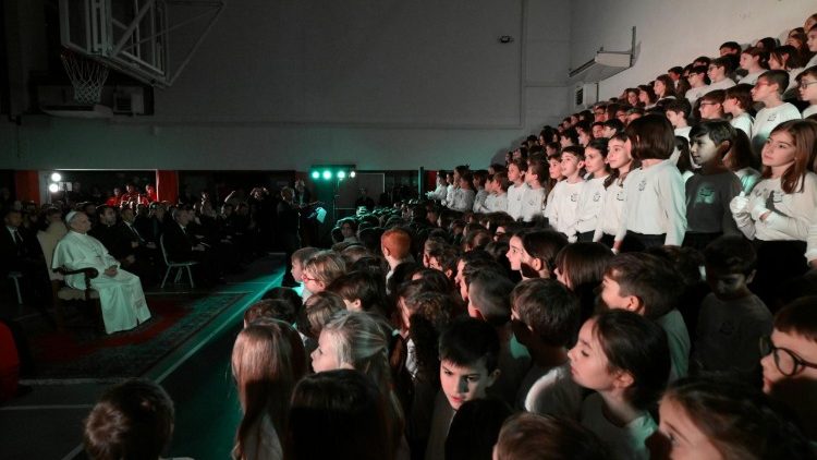 As crianças, todas de jeans e camisetas brancas, tomaram lugar em um palco em degraus, de forma ordenada, uma a uma. Emocionadas e sorridentes, começaram então a cantar, e algumas delas acompanharam as vozes com alegres gestos das mãos. As notas e as palavras de Adeste fideles, Joy to the world, Noël Noël, Astro del ciel espalharam-se pelo público que lotava o ginásio decorado em clima festivo: pais, professores, funcionários da escola, o bispo de Albano, dom Vincenzo Viva, o presidente da Administração do Patrimônio da Sé Apostólica, dom Giordano Piccinotti, e o Papa na primeira fila, ao centro.